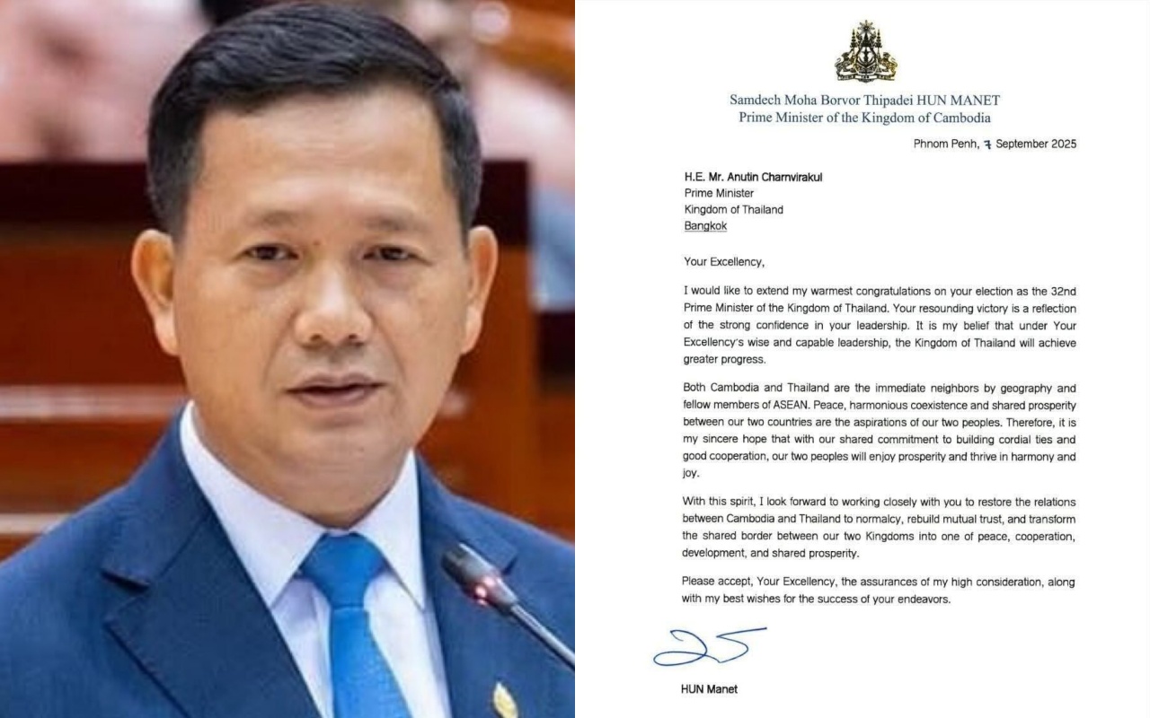 7 ก.ย.2568- พลเอกฮุน มาเนต นายกรัฐมนตรีกัมพูชา โพสต์หนังสือแสดงความยินดีนายอนุทิน ชาญวีรกูล นายกรัฐมนตรีไทย เนื้อหาระบุว่า ข้าพเจ้าขอแสดงความยินดีอย่างสุดซึ้ง ต่อการที่ท่านได้รับเลือกตั้งให้ดำรงตำแหน่งนายกรัฐมนตรีคนที่ 32 แห่งราชอาณาจักรไทย ชัยชนะอันยิ่งใหญ่ของท่านสะท้อนถึงความเชื่อมั่นอย่างแรงกล้าในการเป็นผู้นำของท่าน ข้าพเจ้าเชื่อมั่นว่าภายใต้การนำที่ชาญฉลาดและเปี่ยมด้วยความสามารถของท่าน ราชอาณาจักรไทยจะบรรลุความก้าวหน้าอันยิ่งใหญ่ยิ่งขึ้น
