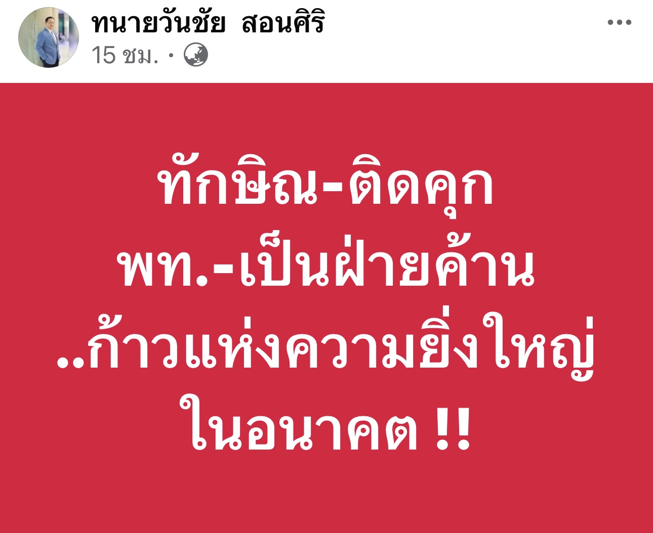10 กันยายน 2568 - นายวันชัย สอนศิริ อดีตสมาชิกวุฒิสภา (สว.) โพสต์เฟซบุ๊กว่า “ทักษิณ-ติดคุก พท.-เป็นฝ่ายค้าน ..ก้าวแห่งความยิ่งใหญ่ในอนาคต!”