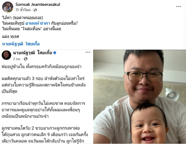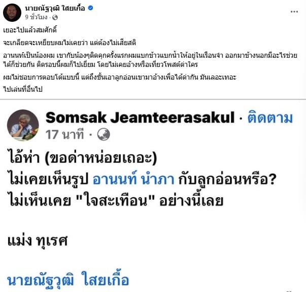 อานนท์เป็นน้องผม เขากับน้องๆติดคุกครั้งแรกผมแบกข้าวแบกน้ำให้อยู่ในเรือนจำ ออกมาข้างนอกมีอะไรช่วยได้ก็ช่วยกัน ติดรอบนี้ผมก็ไปเยี่ยม โดยไม่เคยอ้างหรือเที่ยวโพสต์ด่าใคร