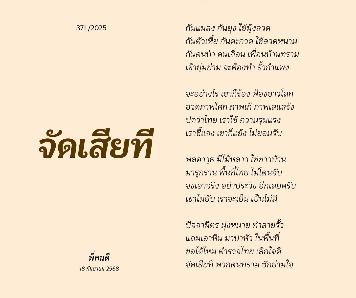 18 ก.ย.2568 - เพจ P.khondee ( พี่คนดี กวีสมัครเล่น) โพสต์ข้อความและร่ายกลอนระบุว่า ไม่มีอะไรต้องคุย หรือต้องรอพิสูจน์อะไรอีกแล้ว มันชัดเจนว่าใครไม่มีความจริงใจ