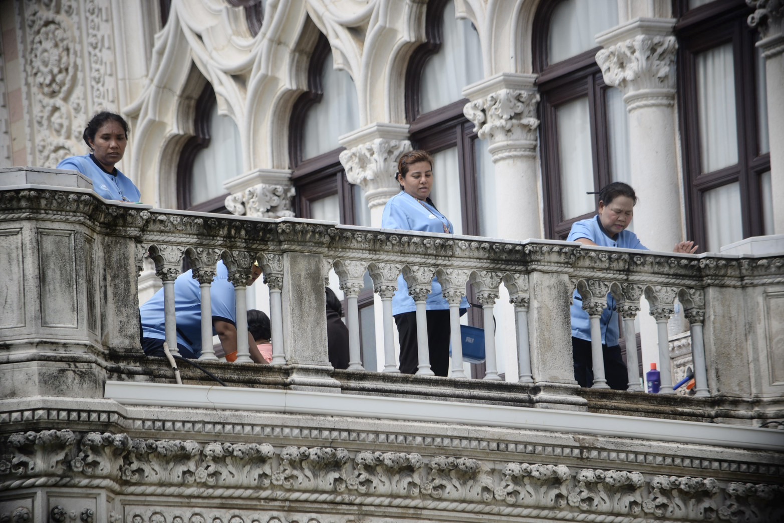 18 ก.ย.2568 - ผู้สื่อข่าวรายงานบรรยากาศทำเนียบรัฐบาล ตั้งแต่ช่วงเช้ามีการเตรียมความพร้อมสถานที่สำหรับต้อนรับคณะรัฐมนตรี (ครม.) ชุดใหม่ โดยในส่วนของตึกไทยคู่ฟ้า ซึ่งมีห้องทำงานของนายกรัฐมนตรี แม่บ้านได้ทำความสะอาดขัดล้างบริเวณระเบียงชั้น 2 บนตึกไทยฯ และมีการตัดแต่งต้นไม้โดยรอบตามปกติ