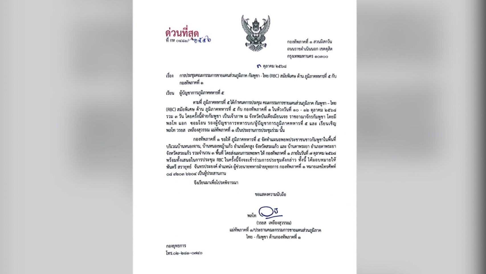 4 ตุลาคม 2568 - ผู้สื่อข่าวรายงานว่าเมื่อวันที่ 3 ต.ค. 68 แม่ทัพภาคที่ 1 ส่งเอกสารด่วนที่สุดถึง ผู้บัญชาการภูมิภาคทหารที่ 5 ของประเทศกัมพูชา โดยมีรายละเอียดระบุว่า