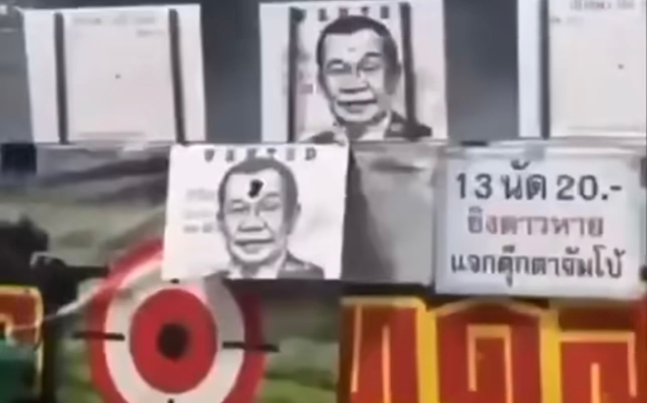 6 ตุลาคม 2568 - สมเด็จฮุน เซน อดีตนายกรัฐมนตรีกัมพูชา โพสต์ข้อความผ่านเฟซบุ๊กส่วนตัว หลังมีการเผยแพร่คลิปและภาพซุ้มยิงเป้าในประเทศไทย ซึ่งใช้ภาพใบหน้าของเขาติดไว้เป็นเป้าซ้อมยิง โดยมีป้ายระบุราคา “13 นัด 20 บาท ยิงดาวหาย แจกตุ๊กตาจัมโบ้”