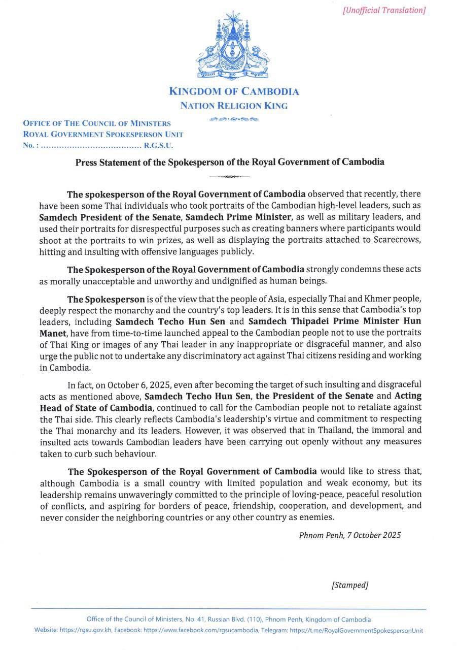 โฆษกของรัฐบาลกัมพูชาขอเน้นย้ำว่า แม้ว่ากัมพูชาจะเป็นประเทศเล็กที่มีประชากรจำกัดและเศรษฐกิจที่อ่อนแอ แต่ผู้นำยังคงยึดมั่นในหลักการแห่งความรักสันติ การแก้ไขข้อขัดแย้งโดยสันติ และมุ่งหวังให้มีพรมแดนแห่งสันติภาพ มิตรภาพ ความร่วมมือ และการพัฒนา และไม่ถือว่าประเทศเพื่อนบ้านหรือประเทศอื่นใดเป็นศัตรู