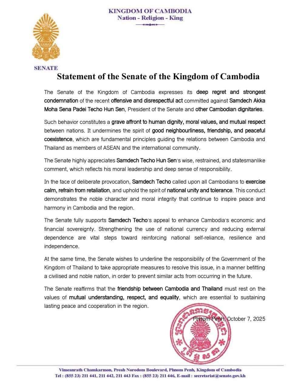 นอกจากนี้ วุฒิสภาแห่งราชอาณาจักรกัมพูชา ออกแถลงการณ์เช่นกัน มีใจความว่า