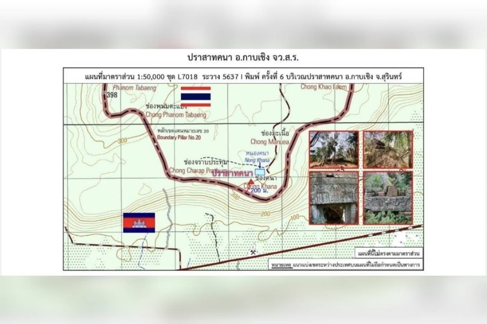 12 ต.ค.2568- ผู้สื่อข่าวรายงานว่า มีข้อมูลจากกองทัพไทยอ้างอิงภาพแผนที่มาตราส่วน 1 ต่อ 50,000 ชุด L7018 ระวาง 5637 พิมพ์ ครั้งที่ 6 ระบุถึงพื้นที่บริเวณปราสาทคนา มีที่ตั้งอยู่บริเวณช่องคนา อ.กาบเชิง จังหวัดสุรินทร์ อยู่ระหว่างหลักเขตแดนที่ 19 ช่องตาเล็ง บ.ตาเกาว์ ต.กาบเชิง อ.กาบเชิง จังหวัดสุรินทร์ และ หลักเขตแดนที่ 20 ช่องจราบประทุม บ.แนงมุด ต.แนงมุด อ.กาบเชิง จังหวัดสุรินทร์