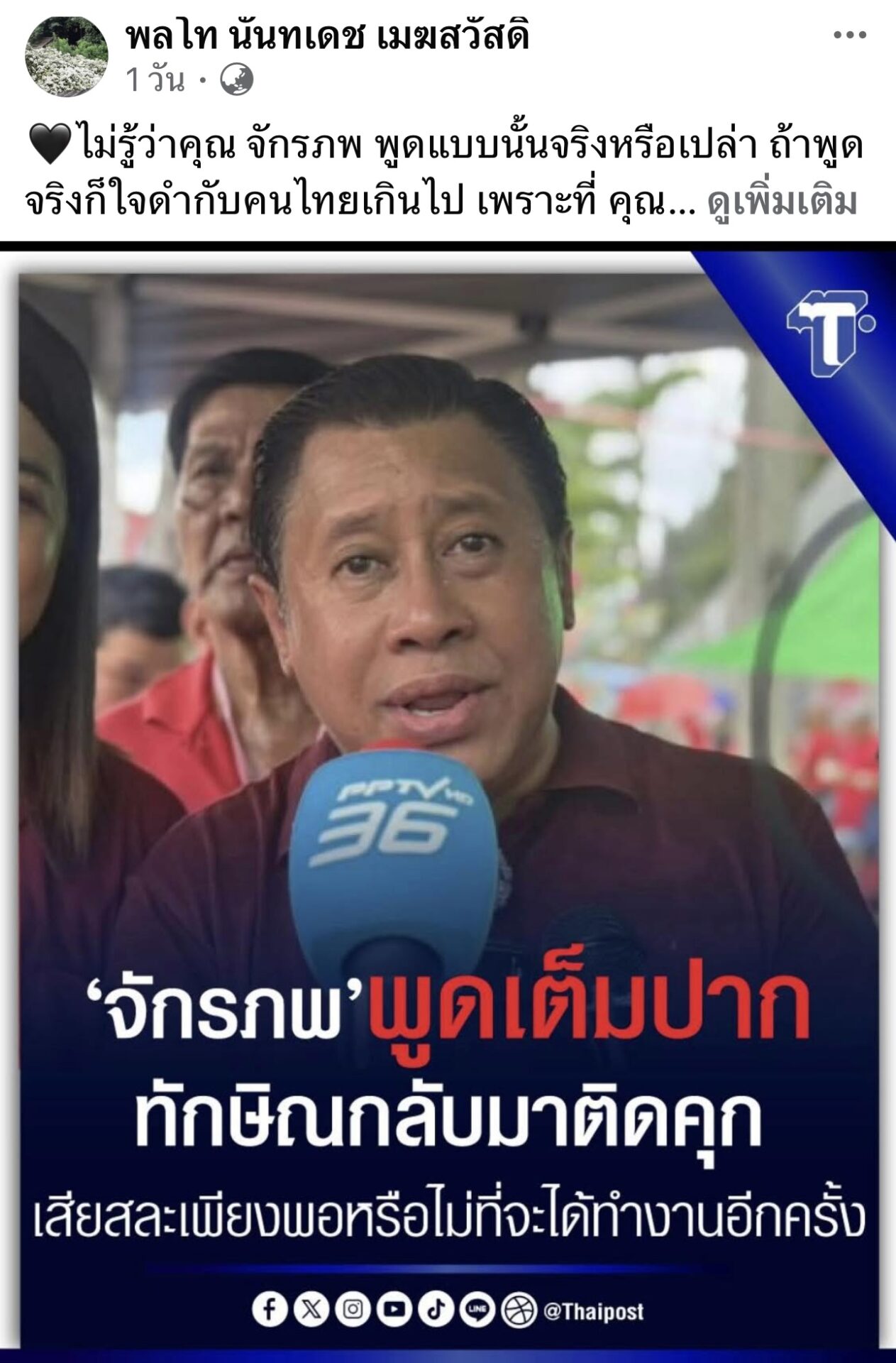 21 ตุลาคม 2568 - พลโทนันทเดช เมฆสวัสดิ์ อดีตหัวหน้าศูนย์ปฏิบัติการพิเศษ ศูนย์รักษาความปลอดภัยแห่งชาติ (ศรภ.) โพสต์เฟซบุ๊กว่าไม่รู้ว่าคุณ จักรภพ พูดแบบนั้นจริงหรือเปล่า ถ้าพูดจริงก็ใจดำกับคนไทยเกินไป เพราะที่ คุณ ทักษิณ ต้องไปติดคุกนั้น เป็นเรื่องที่ต้องไปชดใช้ความผิด คดีทุจริตตามปกติ ที่คุณทักษิณกระทำไว้เองไม่ใช่การเสียสละอะไรเลย และไม่ได้ซับซ้อนอะไร จะมาท้วงบุญคุณอะไรกับคนไทยอีกละครับ งง..?
