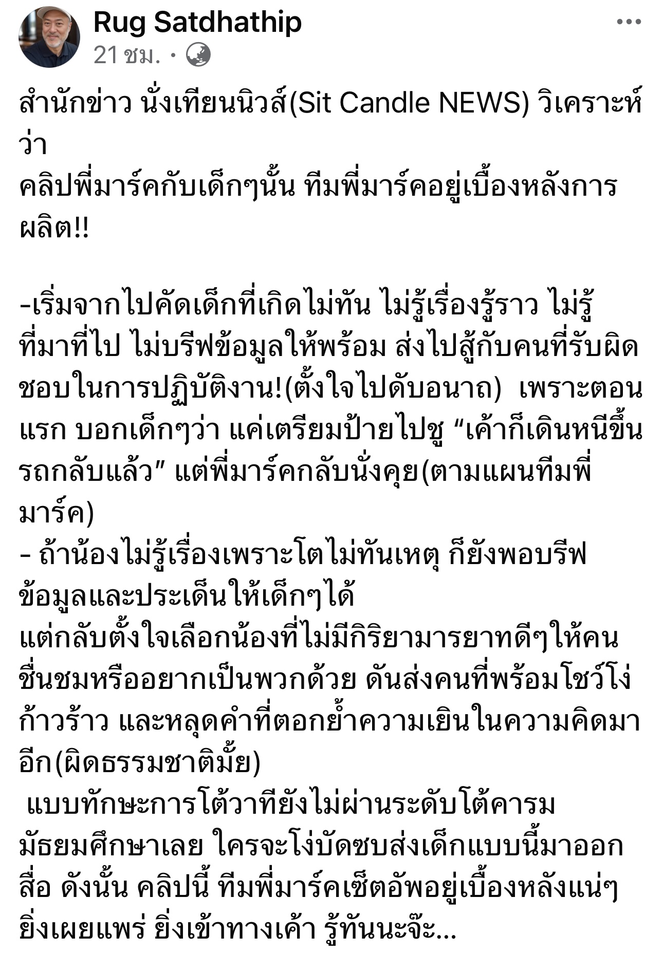 5 พฤศจิกายน 2568 - นายศรัทธา ศรัทธาทิพย์ นักแสดงอิสระ ครูสอนการแสดง และผู้กำกับ โพสต์ข้อความผ่านเฟซบุ๊กส่วนตัวว่า สำนักข่าวนั่งเทียนนิวส์ (Sit Candle NEWS) วิเคราะห์ว่าคลิปพี่มาร์คกับเด็ก ๆ นั้น ทีมพี่มาร์คอยู่เบื้องหลังการผลิต!!