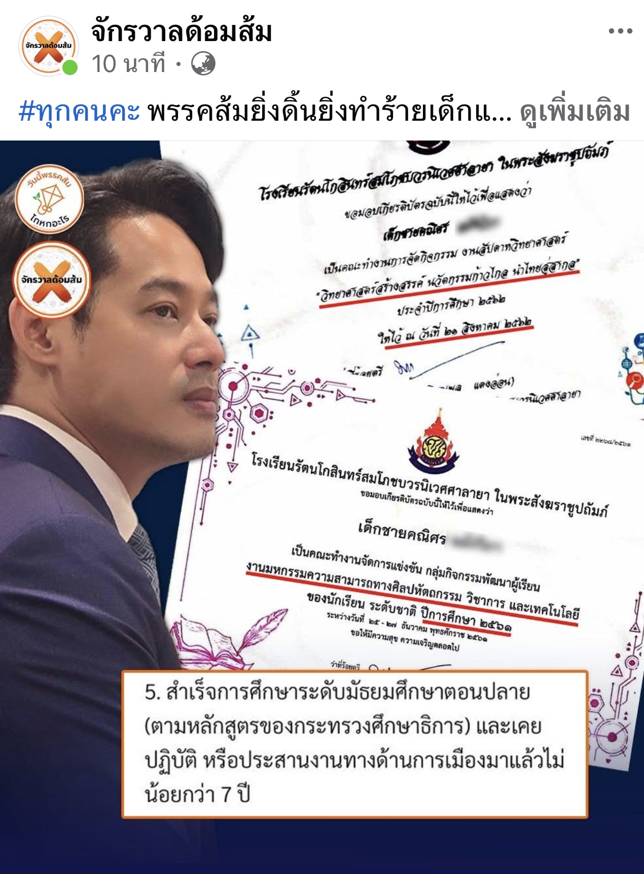 8 พฤศจิกายน 2568 - เฟซบุ๊กเพจ ‘จักรวาลด้อมส้ม’ โพสต์ว่า#ทุกคนคะ พรรคส้มยิ่งดิ้นยิ่งทำร้ายเด็กและเยาวชน