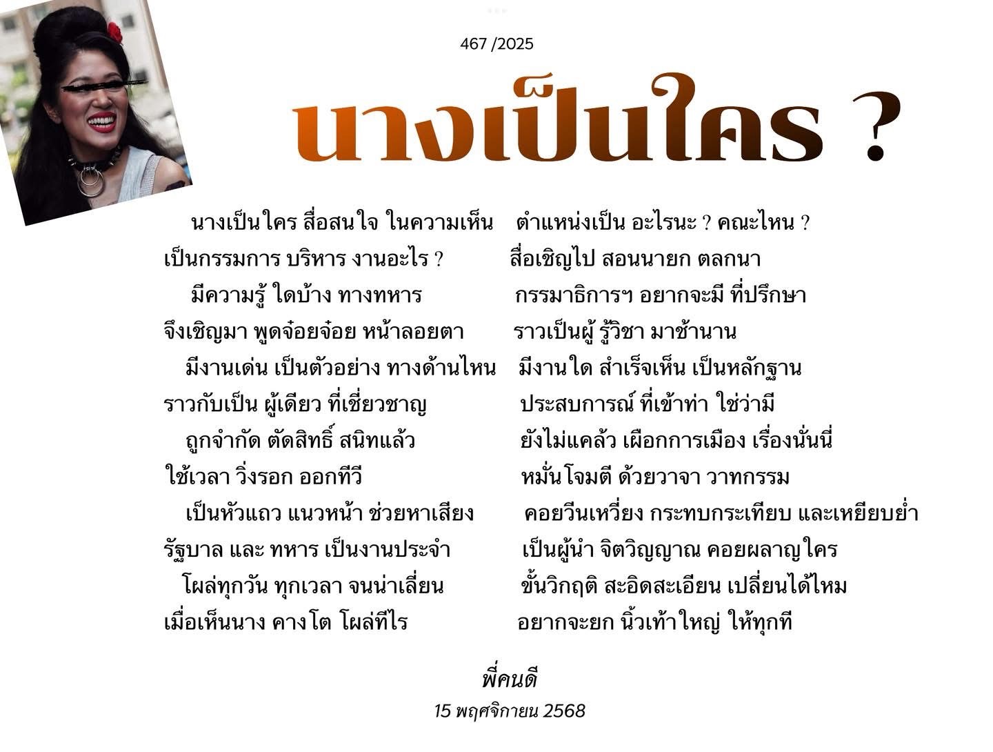 16 พฤศจิกายน 2568 - เพจ P.khondee (พี่คนดี กวีสมัครเล่น) โพสต์บทกลอนในเฟซบุ๊กระบุว่า