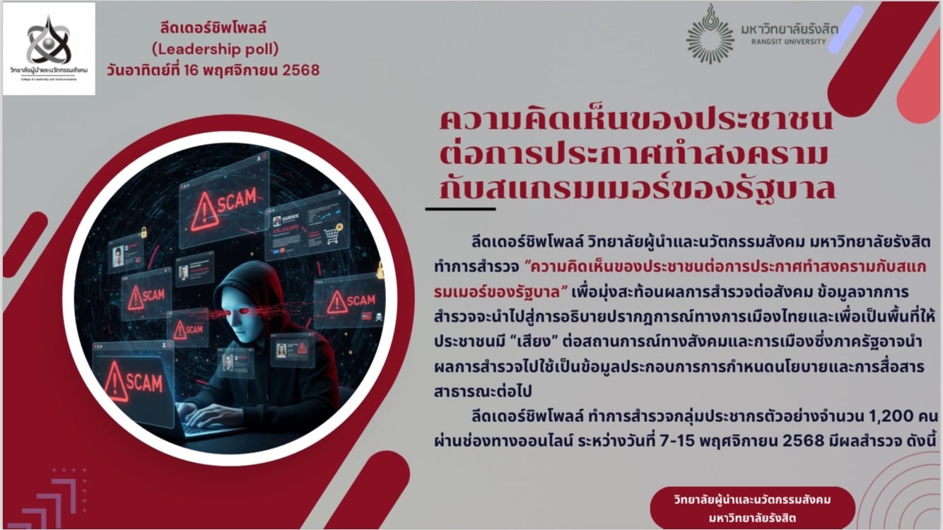16 พฤศจิกายน 2568 - ลีดเดอร์ชิพโพลล์ วิทยาลัยผู้นำและนวัตกรรมสังคม มหาวิทยาลัยรังสิต ทำการสำรวจความคิดเห็นของประชาชนต่อการประกาศทำสงครามกับสแกรมเมอร์ของรัฐบาล จากกลุ่มตัวอย่างจำนวน 1,200 คน ผ่านช่องทางออนไลน์ ระหว่างวันที่ 7-15 พฤศจิกายน 2568