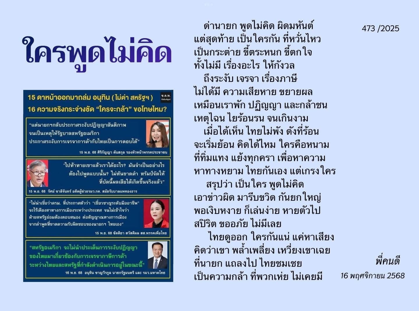 17 พฤศจิกายน 2568 - เพจ P.khondee (พี่คนดี กวีสมัครเล่น) โพสต์บทกลอนในเฟซบุ๊กระบุว่า