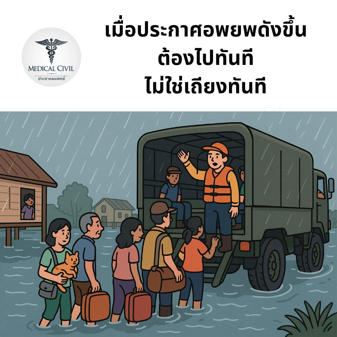 ป้องกันไว้ก่อน ดีกว่าต้องพูดคำว่า “รู้งี้…” ในวันที่สายเกินไป ท้ายที่สุดนี้ เราอยากพูดในนาม “ประชาคมแพทย์” ถึงประชาชนทุกท่านว่า เมื่อผู้ว่าราชการจังหวัด หรือองค์กรปกครองส่วนท้องถิ่น ออกประกาศอพยพเร่งด่วน ไม่ว่าจะเป็นการประเมินที่ “รุนแรงกว่าความเป็นจริง” หรือทำให้ประชาชนรู้สึกว่าต้องรีบละทิ้งทรัพย์สิน สัตว์เลี้ยง หรือความสะดวกสบายของตนเอง—ขอให้เข้าใจว่าการตัดสินใจนั้นเกิดขึ้นเพื่อ รักษาชีวิตของท่านเป็นอันดับแรก