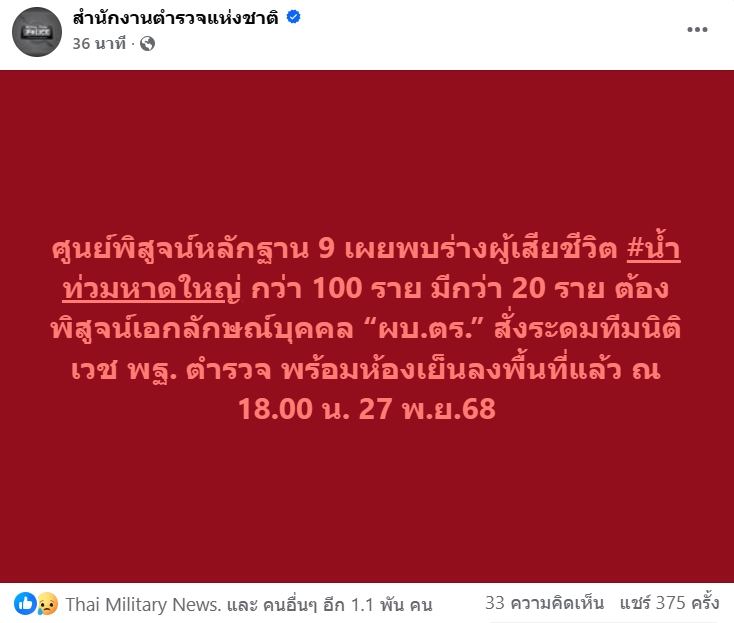 27 พฤศจิกายน 2568 - เพจเฟซบุ๊ก สำนักงานตำรวจแห่งชาติ รายงานว่า ศูนย์พิสูจน์หลักฐาน 9 เผยพบร่างผู้เสียชีวิต #น้ำท่วมหาดใหญ่ กว่า 100 ราย มีกว่า 20 ราย ต้องพิสูจน์เอกลักษณ์บุคคล “ผบ.ตร.” สั่งระดมทีมนิติเวช พฐ. ตำรวจ พร้อมห้องเย็นลงพื้นที่แล้ว ณ 18.00 น. 27 พ.ย.68