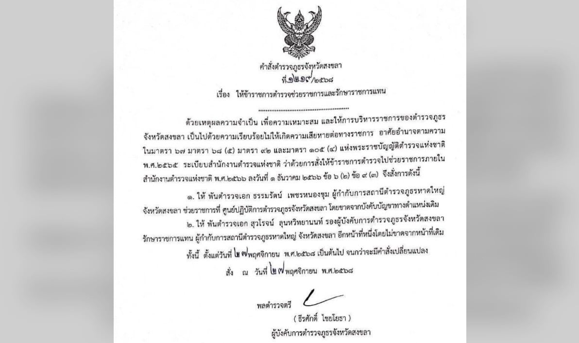 27 พฤศจิกายน 2568 - พล.ต.ต.ธีรศักดิ์ ไชยโยธา ผู้บังคับการตำรวจภูธรจังหวัดสงขลา(ผบก.ภ.จว.สงขลา) เซ็นคำสั่งตำรวจภูธรจังหวัดสงขลาที่ 1219/2568 เรื่อง ให้ข้าราชการตำรวจช่วยราชการและรักษาราชการแทน