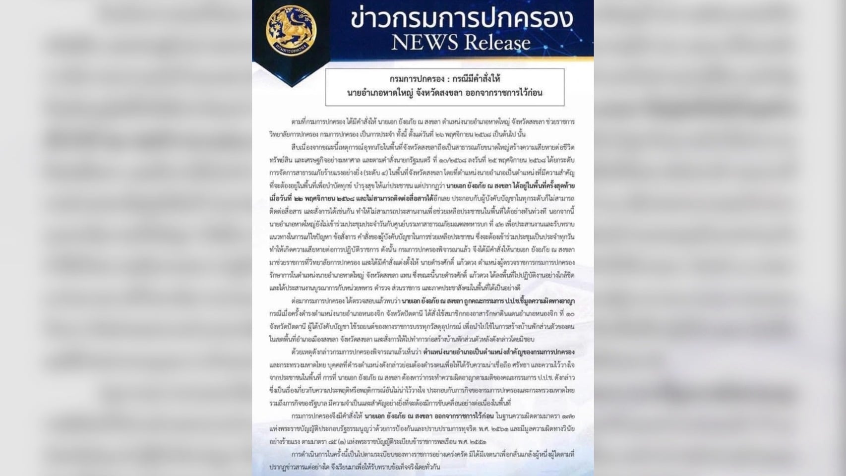สืบเนื่องจากขณะนี้เหตุการณ์อุทกภัยในพื้นที่จังหวัดสงขลาถือเป็นสาธารณภัยขนาดใหญ่สร้างความเสียหายต่อชีวิต ทรัพย์สิน และเศรษฐกิจอย่างมหาศาล และตามคําสั่งนายกรัฐมนตรี ที่ 10/2568 ลงวันที่ 25 พฤศจิกายน 2568 ได้ยกระดับ การจัดการสาธารณภัยร้ายแรงอย่างยิ่ง (ระดับ 4 ) ในพื้นที่จังหวัดสงขลา โดยที่ตําแหน่งนายอําเภอเป็นตําแหน่งที่มีความสําคัญ ที่จะต้องอยู่ในพื้นที่เพื่อบําบัดทุกข์ บํารุงสุขให้แก่ประชาชน แต่ปรากฏว่า นายเอกยังอภัย ณ สงขลา ได้อยู่ในพื้นที่ครั้งสุดท้าย เมื่อวันที่ 22 พฤศจิกายน 2568 และไม่สามารถติดต่อสื่อสารได้อีกเลย ประกอบกับผู้บังคับบัญชาในทุกระดับก็ไม่สามารถติดต่อสื่อสาร และสั่งการได้เช่นกัน ทําให้ไม่สามารถประสานงานเพื่อช่วยเหลือประชาชนในพื้นที่ได้อย่างทันท่วงที