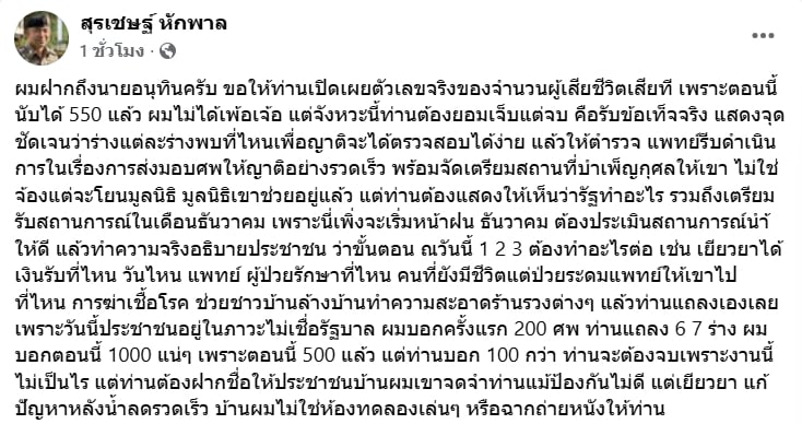 “บิ๊กโจ๊ก-สุรเชชษฐ์ หักพาล” จี้นายกฯอนุทิน เปิดเผยจำนวนผู้เสียชีวิตจากน้ำท่วมอย่างตรงไปตรงมา ระบุข้อมูลที่มีนับได้ 550 ราย พร้อมขอให้รัฐเร่งจัดระบบส่งมอบศพ เยียวยา และอธิบายขั้นตอนช่วยเหลือให้ประชาชนเชื่อมั่น
