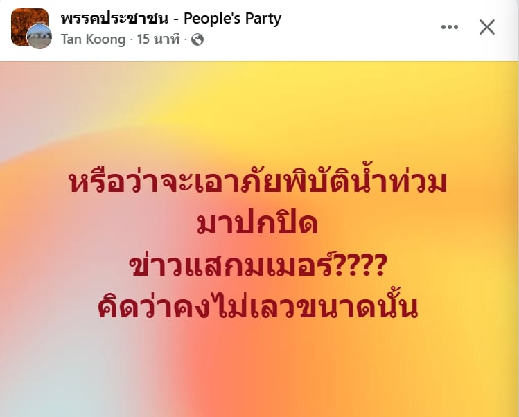 2 ธ.ค. 2568- เพจ พรรคประชาชน – People’s Party ของกลุ่มผู้สนับสนุนพรรคประชาชน โพสต์ข้อความว่า หรือว่าจะเอาภัยพิบัติน้ำท่วม มาปกปิด ข่าวสแกมเมอร์???? คิดว่าคงไม่เลวขนาดนั้น.