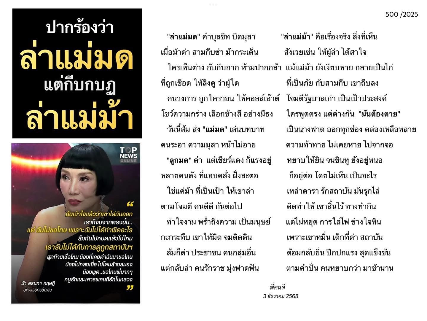 4 ธันวาคม 2568 - เพจ P.khondee (พี่คนดี กวีสมัครเล่น) โพสต์เฟซบุ๊กว่าเหมือนตอนนี้พี่เค้า กำลังโดน เหล่า ศาสดา และอินฟลู สายตาสว่าง ลากมาให้ด้อมยำอีกรอบ โทษฐานยังกระด้างกระเดื่อง ต่อระบบสามกีบ