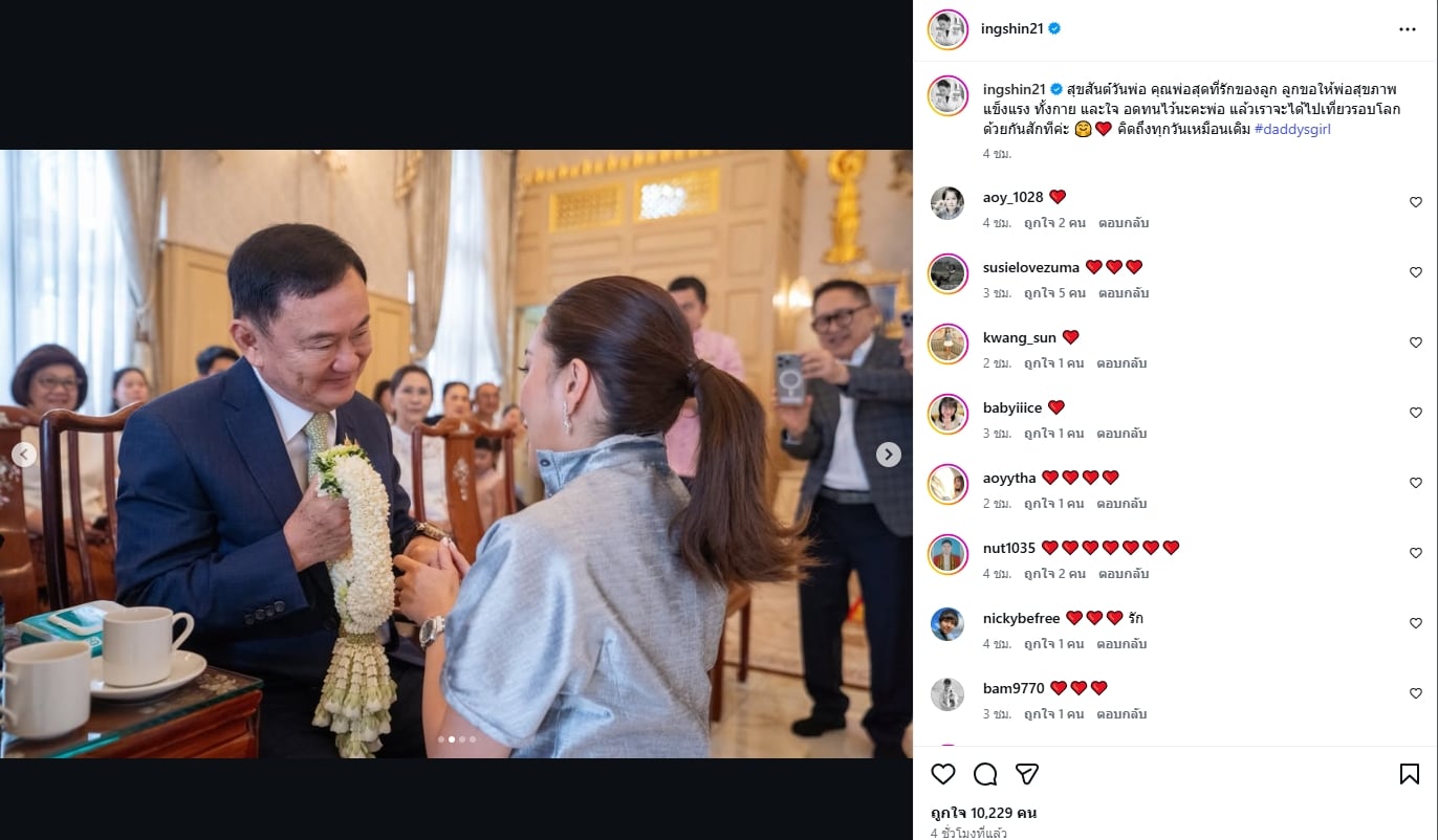 5 ธันวาคม 2568 - น.ส.แพทองธาร ชินวัตร อดีตนายกรัฐมนตรี ในฐานะหัวหน้าครอบครัวเพื่อไทย โพสต์ภาพถ่ายร่วมกับนายทักษิณ ชินวัตร พร้อมระบุข้อความผ่านอินสตาแกรมว่า สุขสันต์วันพ่อ คุณพ่อสุดที่รักของลูก ลูกขอให้พ่อสุขภาพแข็งแรงทั้งกายและใจ อดทนไว้นะคะพ่อ แล้วเราจะได้ไปเที่ยวรอบโลกด้วยกันซักทีค่ะ คิดถึงทุกวันเหมือนเดิม