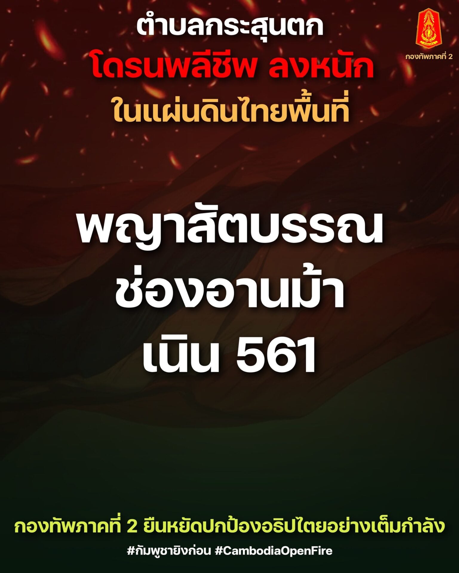 กองทัพภาค 2 ยันควบคุมปราสาทคนา-ถล่มคาสิโนร้างฐานสแกมเมอร์ -ทำลายกระเช้าลำเลียงเนิน 350 ตาควาย-ทำลายเสา Anti Drone พื้นที่พระวิหารและห้วยตามาเรีย -ยึดพื้นที่สวนมะม่วงหิมพานต์รุกเขตไทยที่ช่องระยี พร้อมเฝ้าระวังเขมรโจมตีกลางดึกด้วย BM-21 เพ่งเล็งเป้าหมายเดิม เพื่อสร้างความสับสนในสนามรบ