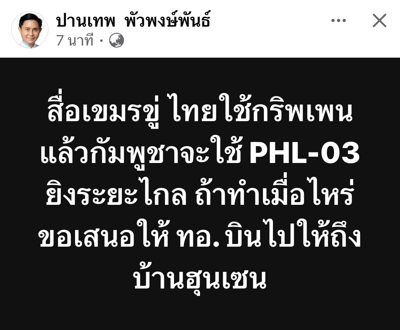 10 ธันวาคม 2568 - นายปานเทพ พัวพงษ์พันธ์ ประธานมูลนิธิยามเฝ้าแผ่นดิน โพสต์เฟซบุ๊กว่า สื่อเขมรขู่ ไทยใช้กริพเพนแล้วกัมพูชาจะใช้ PHL-03 ยิงระยะไกล ถ้าทำเมื่อไหร่ขอเสนอให้ ทอ. บินไปให้ถึงบ้านฮุนเซน.