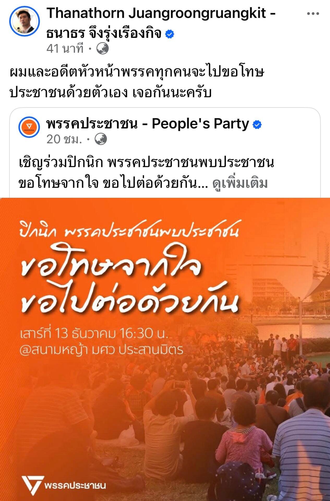 ทั้งนี้ ข้อความดังกล่าวเป็นการโพสต์ประกอบการเชิญชวนของพรรคประชาชน ซึ่งเชิญประชาชนร่วมกิจกรรมพบปะในรูปแบบปิกนิก เพื่อเปิดพื้นที่พูดคุย รับฟังความคิดเห็น และกล่าวคำขอโทษต่อประชาชน