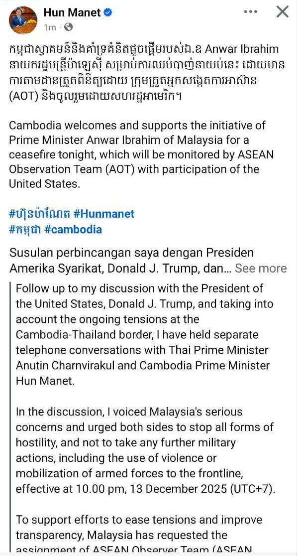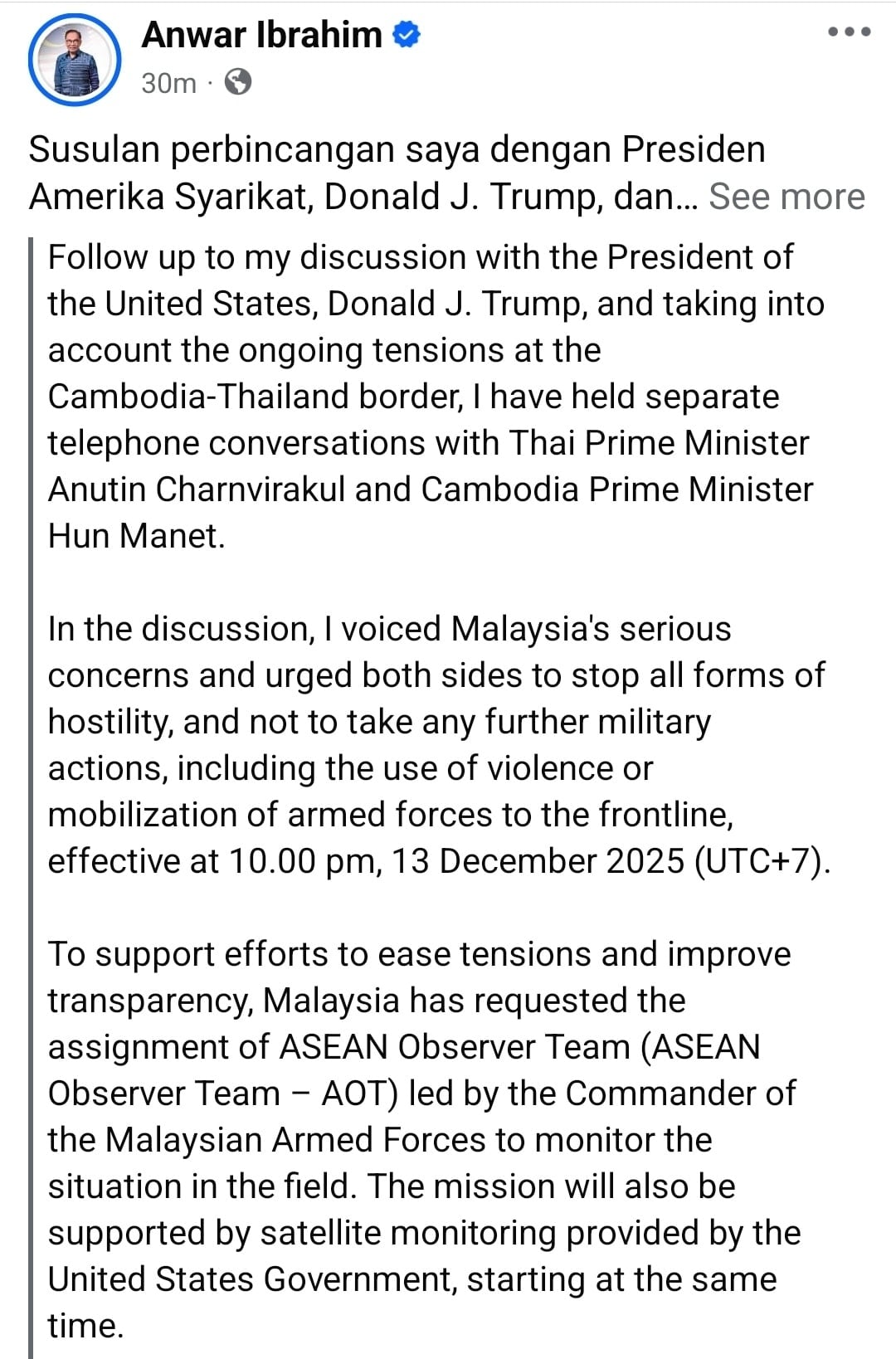 ในการหารือเหล่านั้น ผมได้แสดงความกังวลอย่างยิ่งของมาเลเซีย และเรียกร้องให้ทั้งสองฝ่ายยุติการสู้รบทั้งหมด และไม่ดำเนินการทางทหารใดๆ เพิ่มเติม รวมถึงการใช้กำลังหรือการส่งกำลังทหารไปยังแนวหน้า โดยมีผลบังคับใช้เวลา 22.00 น. ของวันที่ 13 ธันวาคม 2568 (UTC+7)