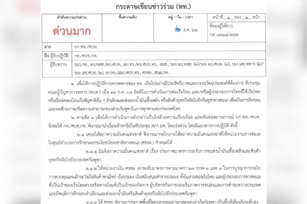 14 ธ.ค.2568-มีหนังสือด่วนจาก กองบัญชาการกองทัพไทย(บก.ทท.) และ ศูนย์บัญชาการทางทหาร (ศบท.) แจ้ง 1.เพื่อให้การปฏิบัติการทางทหารของกองทัพไทย เป็นไปอย่างมีประสิทธิภาพและบรรลุวัตถุประสงค์ที่ต้องการ ที่ประชุม คณะผู้บัญชาการทหาร (คบท.) เมื่อ 12 ธ.ค. 68 มีมติในการดำเนินการต่อเรือไทย และ/หรือผู้ประกอบการไทยที่ไช้เรือไทย หรือเรือจดทะเบียนเรือสัญชาติอื่น ๆ ลำเลืองและส่งออกน้ำมันเชื้อเพลิง หรือสินค้ายุทธปัจจัยไปยังกัมพูชาทางทะเล เพื่อเป็นการลิดรอบและลดศักยภาพ ขีดความสามารถของฝ่ายกัมพูชาในการคุกคามต่อประเทศไทย