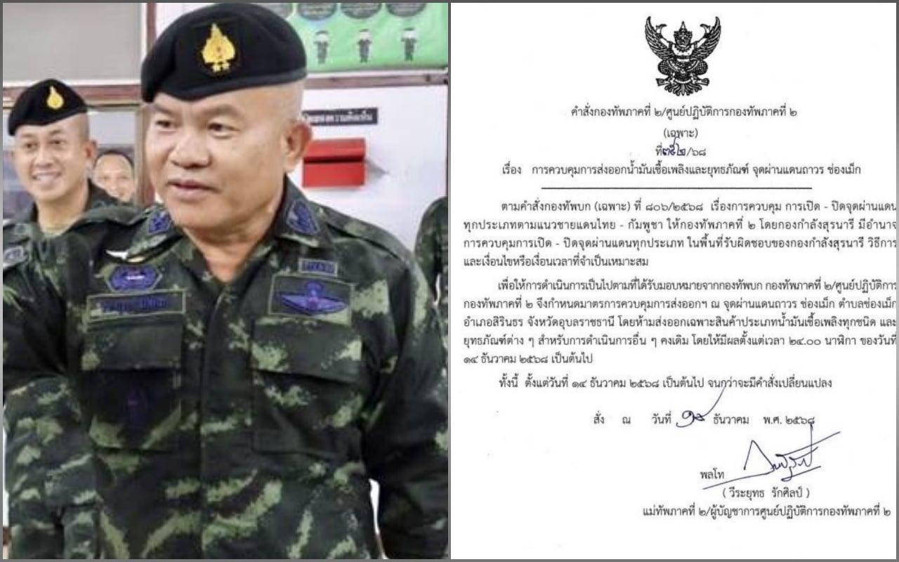 15 ธ.ค.2568-พลโทวีระยุทธ รักศิลป์ แม่ทัพภาคที่ 2 และผู้บัญชาการศูนย์ปฏิบัติการกองทัพภาคที่ 2 ลงนามในคำสั่งกองทัพภาคที่ 2 เรื่อง การควบคุมการส่งออกน้ำมันเชื้อเพลิงและยุทธภัณฑ์ จุดผ่านแดนถาวร ช่องเม็ก เนื้อหาระบุว่า ตามคำสั่งกองทัพบก (เฉพาะ) ที่ 806/2568 เรื่องการควบคุม การเปิด – ปิดจุดผ่านแดน ทุกประเภทตามแนวชายแดนไทย – กัมพูชา ให้กองทัพภาคที่ 2 โดยกองกำลังสุรนารี มีอำนาจการควบคุมการเปิด – ปิดจุดผ่านแดนทุกประเภท ในพื้นที่รับผิดชอบของกองกำลังสุรนารี วิธีการและเงื่อนไขหรือเงื่อนเวลาที่จำเป็นเหมาะสม