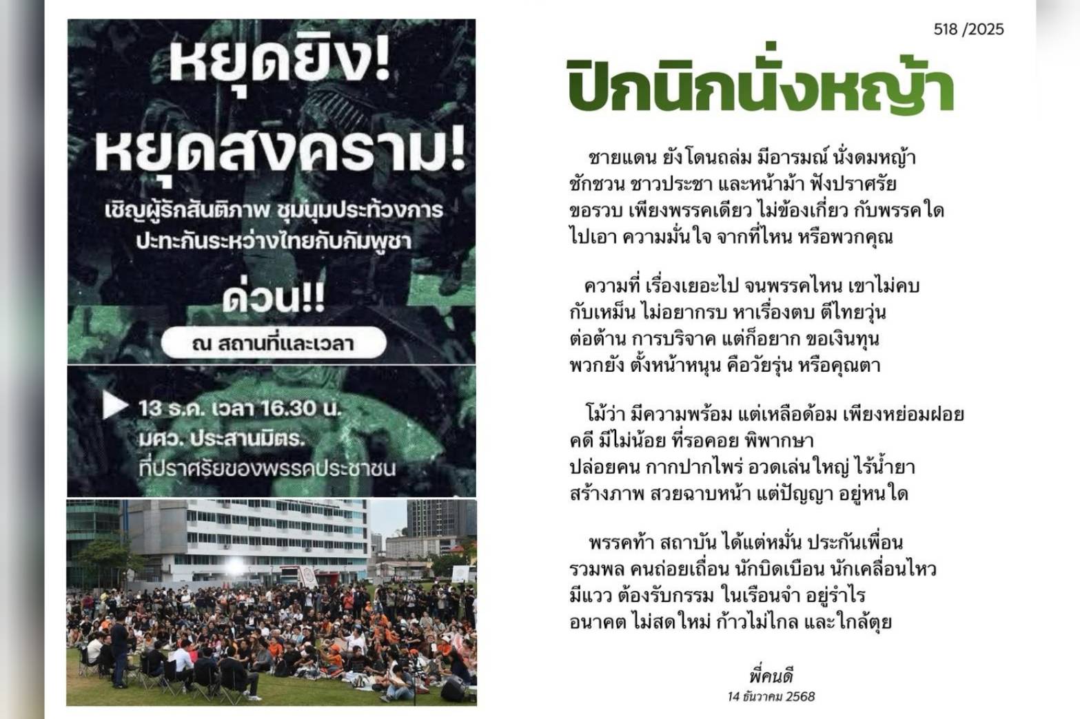 เพจ P.khondee (พี่คนดี กวีสมัครเล่น) โพสต์บทกลอนในเฟซบุ๊กระบุว่า
