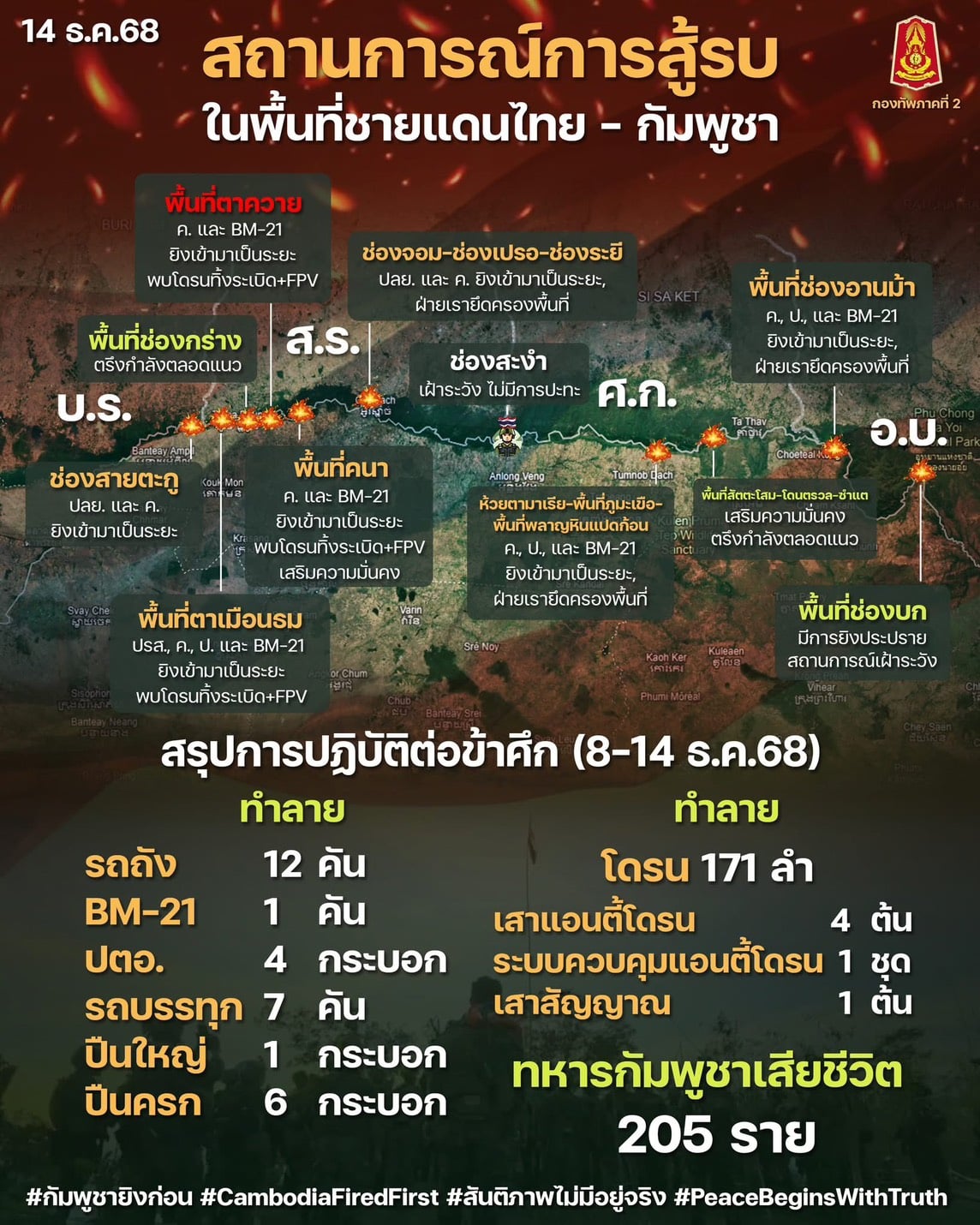 ทภ.2 เผย ผบ.หน่วยฯเขมรรบเดือด เนิน 350 "ยอมแลก" ระดมยิงใส่พื้นที่สังหารพื้นฝ่ายตนเอง กัมพูชาปรับแผนรับมือตลอดแนว ด้านห้วยตามาเรีย ใช้วัดแก้วฯเป็นฐานยิงใส่ พร้อมมีคำสั่งทำลายพื้นที่เชิงสัญลักษณ์ สรุปรบ 7 วัน 8-14 ธ.ค. ไทยทำลายที่มั่นทหารกัมพูชา 54 แห่ง รถถัง 12 คัน, โดรน 171 ลำ, BM-21 1 คัน, เสาแอนตี้โดรน 4 ต้น ทหารกัมพูชาเสียชีวิต 205 ราย