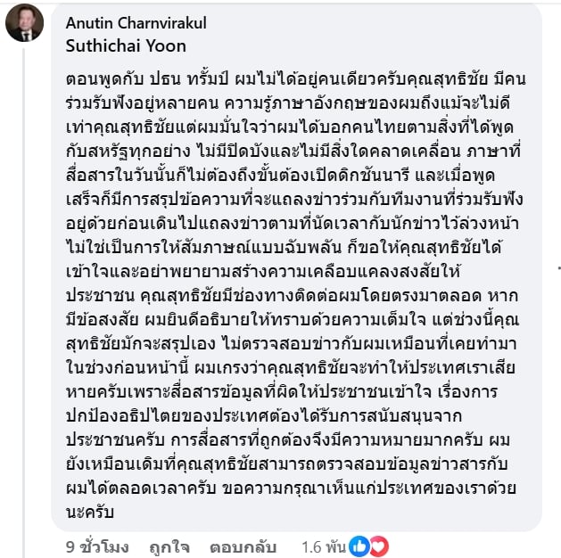 ปรากฏว่านายอนุทิน ชาญวีรกูล นายกรัฐมนตรี เข้าไปคอมเมนต์ชี้แจงในเพจ Suthichai Yoon ว่า ตอนพูดกับ ปธน ทรั้มป์ ผมไม่ได้อยู่คนเดียวครับคุณสุทธิชัย มีคนร่วมรับฟังอยู่หลายคน ความรู้ภาษาอังกฤษของผมถึงแม้จะไม่ดีเท่าคุณสุทธิชัยแต่ผมมั่นใจว่าผมได้บอกคนไทยตามสิ่งที่ได้พูดกับสหรัฐทุกอย่าง ไม่มีปิดบังและไม่มีสิ่งใดคลาดเคลื่อน ภาษาที่สื่อสารในวันนั้นก็ไม่ต้องถึงขั้นต้องเปิดดิกชันนารี และเมื่อพูดเสร็จก็มีการสรุปข้อความที่จะแถลงข่าวร่วมกับทีมงานที่ร่วมรับฟังอยู่ด้วยก่อนเดินไปแถลงข่าวตามที่นัดเวลากับนักข่าวไว้ล่วงหน้า ไม่ใช่เป็นการให้สัมภาษณ์แบบฉับพลัน