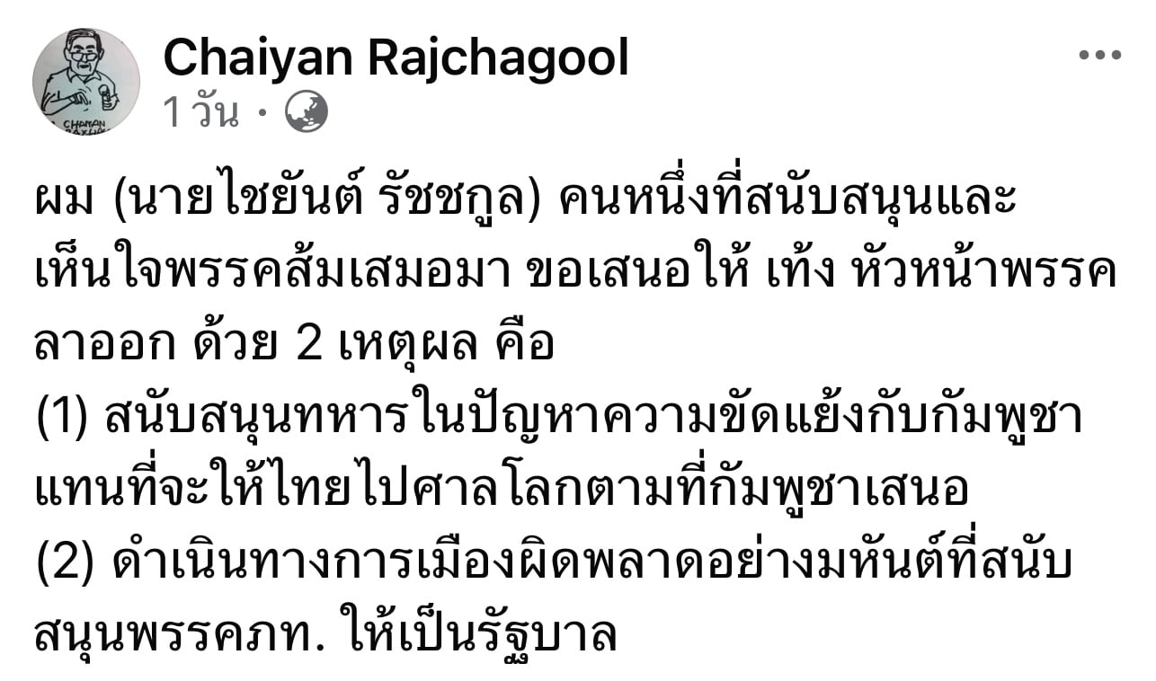 “ไชยันต์ รัชชกูล” อาจารย์ประจำคณะรัฐศาสตร์และสังคมศาสตร์ มหาวิทยาลัยพะเยา ซึ่งแสดงตัวเป็นผู้สนับสนุนพรรคประชาชน เรียกร้องให้หัวหน้าพรรคลาออก ชี้เหตุผลทั้งจุดยืนต่อปัญหาชายแดนไทย-กัมพูชา และการตัดสินใจสนับสนุนพรรคภูมิใจไทยจัดตั้งรัฐบาล