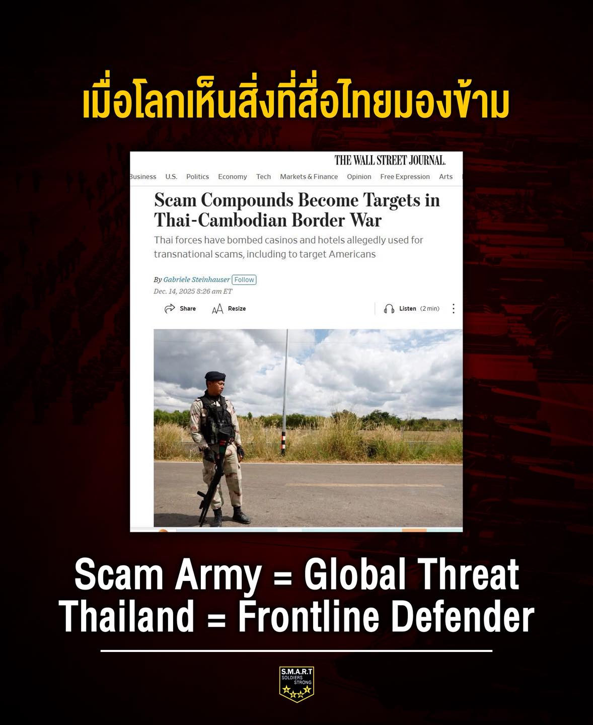 18 ธ.ค.2568 – เพจ SMART Soldiers Strong ARMY โพสต์เฟซบุ๊กในหัวข้อ “เมื่อโลกเห็นสิ่งที่สื่อไทยมองข้าม” ระบุว่า Scam Army = Global Threat, Thailand = Frontline Defender