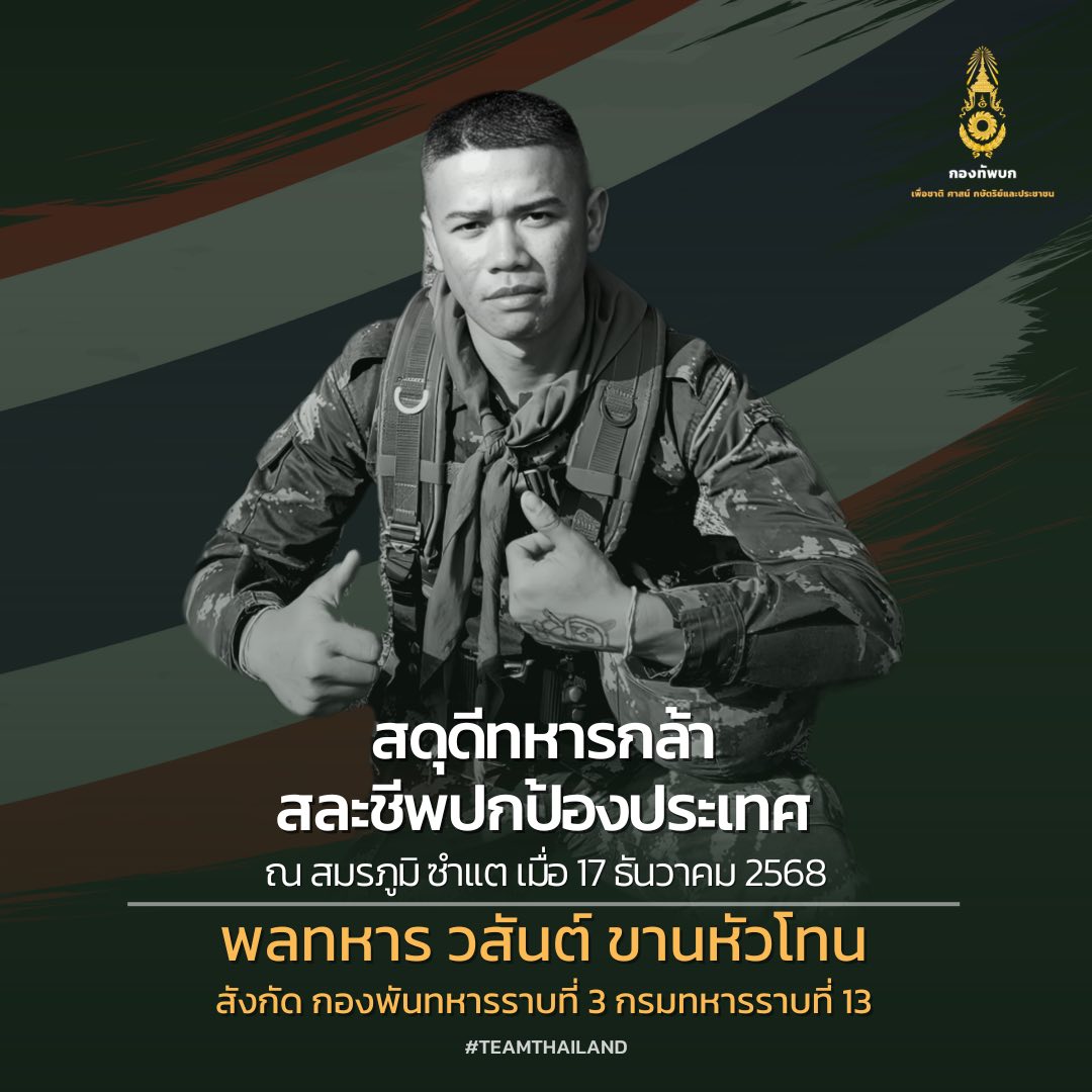 21. พลทหาร วสันต์ ขานหัวโทน สังกัด กองพันทหารราบที่ 3 กรมทหารราบที่ 13 เสียชีวิตในสมรภูมิ ซำแต เมื่อวันที่ 17 ธันวาคม 2568