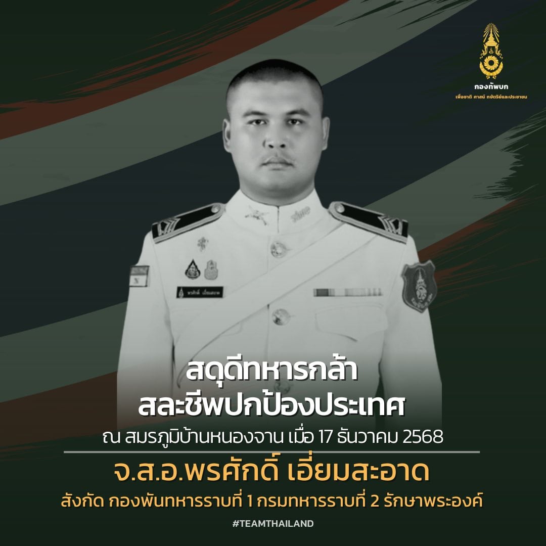 20. จ.ส.อ.พรศักดิ์ เอี่ยมสะอาด สังกัด กองพันทหารราบที่ 1 กรมทหารราบที่ 2 รักษาพระองค์ เสียชีวิตในสมรภูมิ บ้านหนองจาน เมื่อวันที่ 17 ธันวาคม 2568