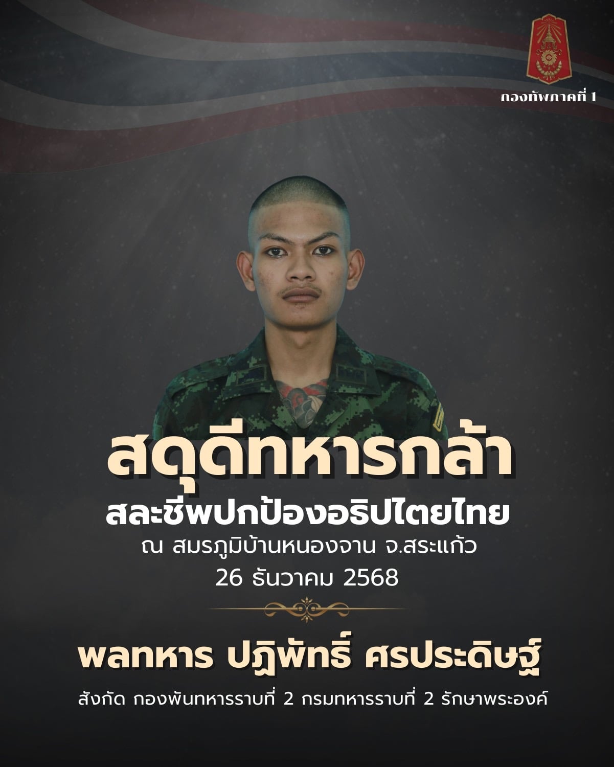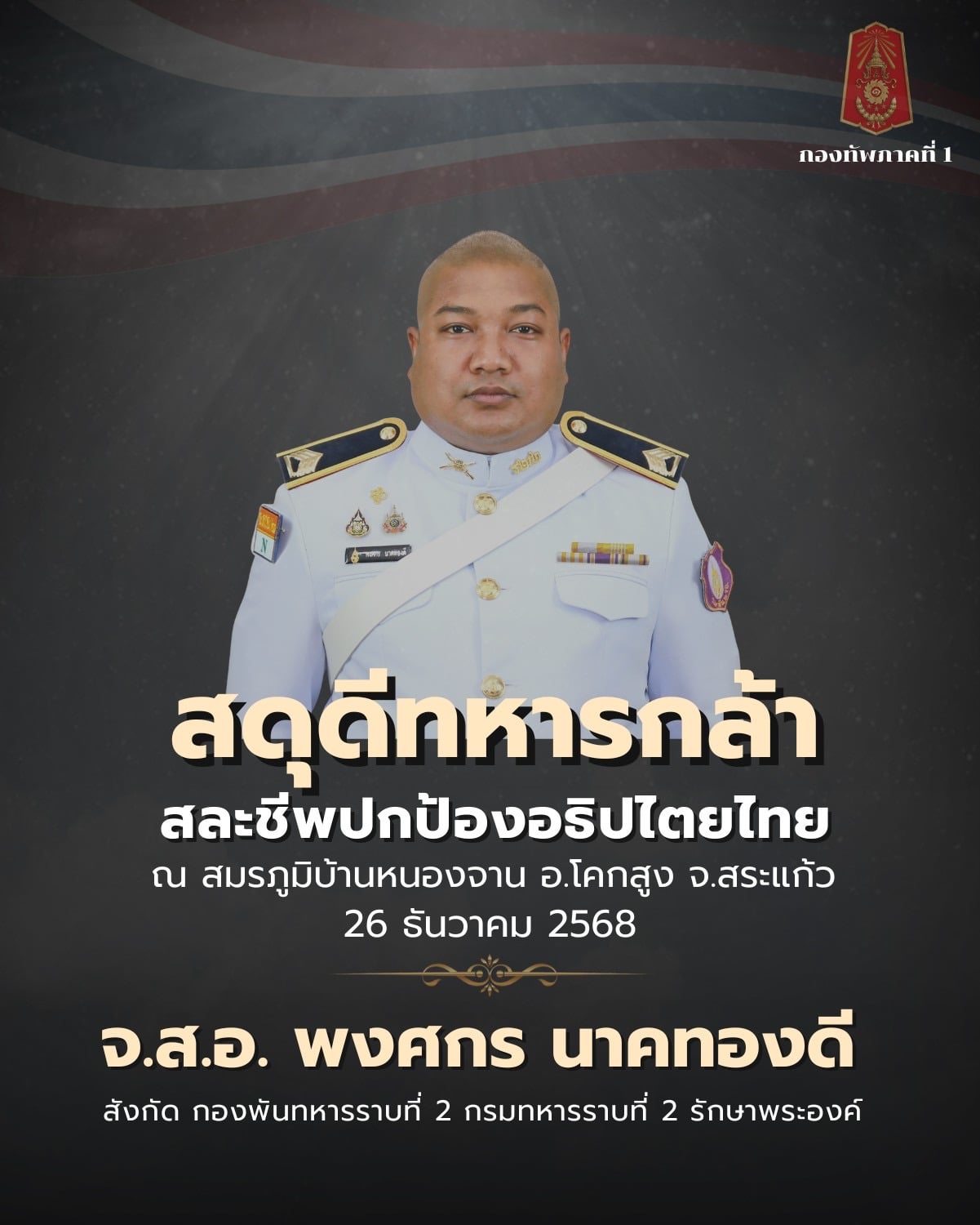 26 ธันวาคม 2568 - กองทัพภาคที่ 1 ขอแสดงความเสียใจอย่างสุดซึ้งต่อครอบครัว จ.ส.อ.พงศกร นาคทองดี, พลทหาร ปฏิพัทธิ์ ศรประดิษฐ์ และพลทหาร ทิวตะวัน พลเยี่ยม สังกัด กองพันทหารราบที่ 2 กรมทหารราบที่ 2 รักษาพระองค์ เสียชีวิตจากการปฏิบัติหน้าที่ปกป้องอธิปไตยของชาติ ในพื้นที่ชายแดนไทย-กัมพูชา บ้านหนองจาน อ.โคกสูง จ.สระแก้ว เมื่อ 26 ธ.ค.68