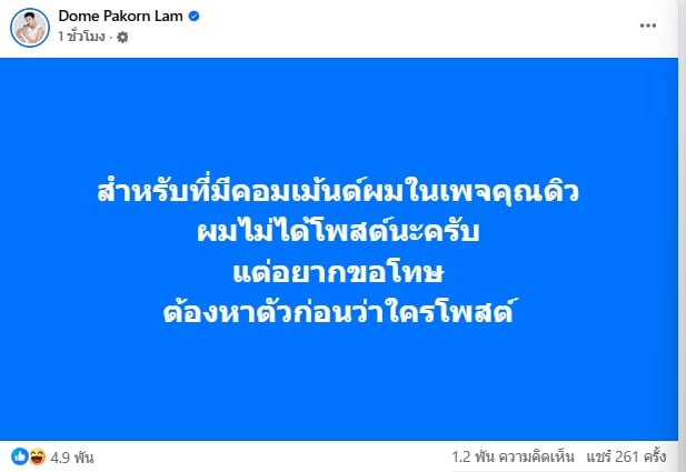 ล่าสุดเฟซบุ๊ค “โดม ปกรณ์ ลัม” โพสท์ว่า “สำหรับที่มีคอมเม้นต์ผม ผมไม่ได้โพสต์นะครับ ต้องหาตัวก่อนว่าใครโพสต์”