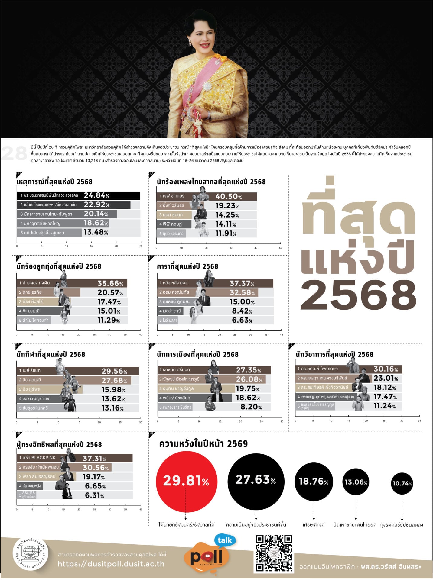 31 ธ.ค.2568 - สวนดุสิตโพล มหาวิทยาลัยสวนดุสิต ได้สำรวจความคิดเห็นของประชาชน กรณี “ที่สุดแห่งปี” เป็นปีที่ 28 โดยครอบคลุมทั้งด้านการเมือง เศรษฐกิจ สังคม ที่สะท้อนออกมาในด้านหน่วยงาน บุคคลที่เกี่ยวพันกับชีวิตประจำวันตลอดปี ขั้นตอนแรกได้สำรวจ ด้วยคำถามปลายเปิดให้ประชาชนเสนอบุคคลที่ตนเองชื่นชอบ จากนั้นจึงนำคำตอบมาสร้างเป็นแบบสอบถามให้ประชาชนได้ตอบแสดงความเห็นและสรุปเป็นฐานข้อมูล โดยในปี 2568 นี้ได้สำรวจความคิดเห็นจากประชาชนทุกสาขาอาชีพทั่วประเทศ จำนวน 10,218 คน (สำรวจทางออนไลน์และภาคสนาม) ระหว่างวันที่ 15-26 ธันวาคม 2568 สรุปผลได้ดังนี้