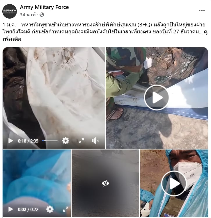1 มกราคม 2569 - เพจเฟซบุ๊ก Army Military Force เผยแพร่คลิปวิดีโอพร้อมข้อความว่า ทหารกัมพูชาเข้าเก็บร่างทหารองครักษ์พิทักษ์ฮุนเซน (BHQ) หลังถูกปืนใหญ่ของฝ่ายไทยยิงโจมตี ก่อนข้อกำหนดหยุดยิงจะมีผลบังคับใช้ในเวลาเที่ยงตรง ของวันที่ 27 ธันวาคม