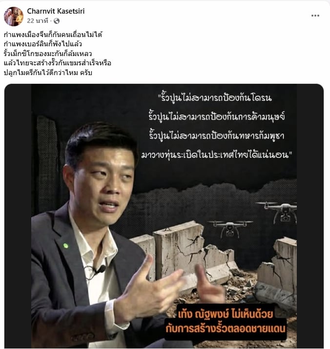 5 มกราคม 2569 - ศ.พิเศษ ดร.ชาญวิทย์ เกษตรศิริ อดีตอธิการบดีมหาวิทยาลัยธรรมศาสตร์ โพสต์เฟซบุ๊กโดยแชร์ภาพนายณัฐพงษ์ เรืองปัญญาวุฒิ หัวหน้าพรรคประชาชน ออกมาระบุว่า "ไม่เห็นด้วยกับการสร้างรั้วชายแดน เพราะรั้วปูนไม่สามารถป้องกันโดรน รั้วปูนไม่สามารถป้องกันการค้ามนุษย์ รั้วปูนไม่สามารถป้องกันทหารกัมพูชามาวางทุ่นระเบิดในประเทศไทยได้แน่นอน"