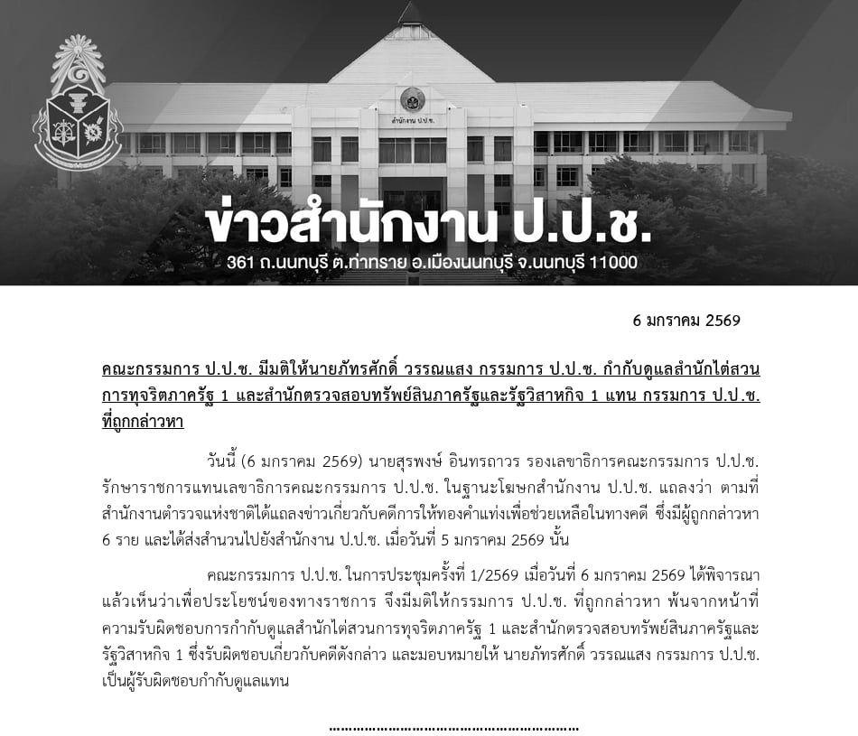 คณะกรรมการ ป.ป.ช. ในการประชุมครั้งที่ 1/2569 วันที่ 6 มกราคม 2569 ได้พิจารณาแล้วเห็นว่าเพื่อประโยชน์ของทางราชการ จึงมีมติให้กรรมการป.ป.ช. ที่ถูกกล่าวหาพ้นจากหน้าที่ความรับผิดชอบการกำกับดูแลสำนักไต่สวนการทุจริตภาครัฐ1(สตร.1) และสำนักตรวจสอบทรัพย์สินภาครัฐและรัฐวิสาหกิจ 1 (สทว.1) ซึ่งรับผิดชอบเกี่ยวกับคดีดังกล่าว โดยมอบหมายให้ นายภัทรศักดิ์ วรรณแสง กรรมการ ป.ป.ช. เป็นผู้รับผิดชอบกำกับดูแลแทน