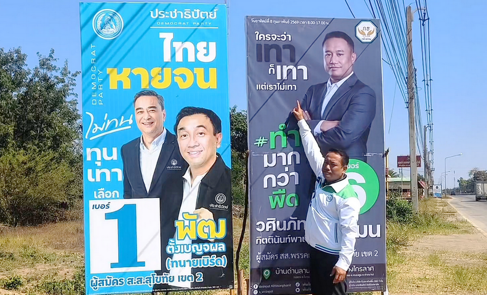 22 มกราคม 2569 - ผู้สื่อข่าวรายงาน กรณีชาวบ้านพากันสงสัย ป้ายหาเสียงพรรคกล้าธรรมระบุข้อความสะดุดตา “ใครจะว่าเทาก็เทา แต่เราไม่เทา” และ “ทำมากกว่าพืด” ของนายวศินภัทร์ กิตตินันท์พาณิช (ช่างมน) ผู้สมัคร ส.ส.สุโขทัย เขต 2 พรรคกล้าธรรม โผล่ประกบป้าย “ทนายเบิร์ด” พรรคประชาธิปัตย์ในหลายจุด ต้องการจะสื่อความหมายอะไร หรือว่าเป็นการประชดตอบโต้อีกฝ่ายที่ขึ้นป้าย “ไม่ทนทุนเทา” จนกลายเป็นกระแส