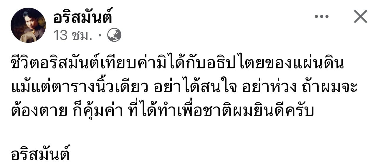 โดยนายอริสมันต์ระบุว่า “ชีวิตอริสมันต์เทียบค่ามิได้กับอธิปไตยของแผ่นดินแม้แต่ตารางนิ้วเดียว อย่าได้สนใจ อย่าห่วง ถ้าผมจะต้องตาย ก็คุ้มค่า ที่ได้ทำเพื่อชาติผมยินดีครับ”
