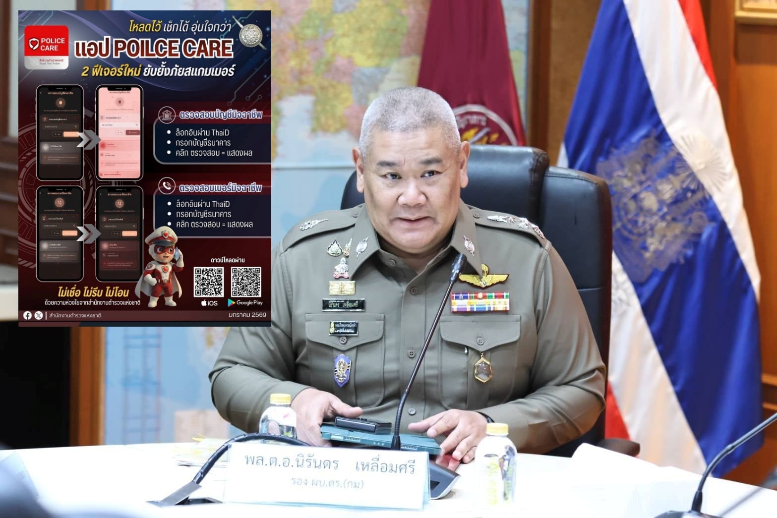 รอง ผบ.ตร. เปิดเผยว่า สำนักงานตำรวจแห่งชาติตั้งใจให้ POLICE CARE เป็นแอปพลิเคชัน ONE STOP SERVICE ของประชาชน ด้วยความห่วงใย พล.ต.อ.กิตติ์รัฐ พันธุ์เพ็ชร์ ผู้บัญชาการตำรวจแห่งชาติ มีนโยบายให้พัฒนาแอปพลิเคชันนี้เป็นตัวช่วยในเรื่องการป้องกันภัยอาชญากรรมที่อาจเกิดขึ้นกับประชาชนได้ด้วย ซึ่งสำนักงานตำรวจแห่งชาติให้ความสำคัญกับภัยออนไลน์จากสแกมเมอร์ที่มาหลากหลายรูปแบบ สำนักงานตำรวจแห่งชาติจึงพัฒนาเพิ่ม 2 ฟีเจอร์ ในแอปพลิเคชัน POLICE CARE ที่เชื่อมโยงฐานข้อมูลแจ้งความออนไลน์ มีฐานข้อมูลหมายเลขบัญชีมิจฉาชีพ และฐานข้อมูลเบอร์โทรมิจฉาชีพ เพื่อให้ประชาชนตรวจสอบก่อนเกิดเหตุ ยับยั้งภัยสแกมเมอร์