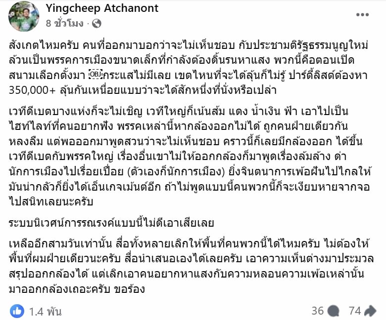 สังเกตไหมครับ คนที่ออกมาบอกว่าจะไม่เห็นชอบ กับประชามติรัฐธรรมนูญใหม่ ล้วนเป็นพรรคการเมืองขนาดเล็กที่กำลังต้องดิ้นรนหาแสง พวกนี้คือตอนเปิดสนามเลือกตั้งมา กระแสไม่มีเลย เขตไหนที่จะได้ลุ้นก็ไม่รู้ ปาร์ตี้ลิสต์ต้องหา 350,000+ ลุ้นกันเหนื่อยแบบว่าจะได้สักหนึ่งที่นั่งหรือเปล่า
