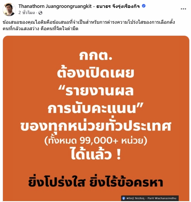 10 กุมภาพันธ์ 2569 - นายธนาธร จึงรุ่งเรืองกิจ ผู้นำจิตวิญญาณพรรคส้ม ประธานคณะก้าวหน้า ได้แชร์ข้อความของนายพริษฐ์ วัชรสินธุ โฆษกพรรคประชาชน (ปชน.) ซึ่งโพสต์เฟซบุ๊กเรียกร้องให้คณะกรรมการการเลือกตั้ง (กกต.) เปิดรายงานผลนับคะแนนรายหน่วยทั่วประเทศ (ทั้งหมด 99,000+ หน่วย) หลังจากพบปัญหาการนับคะแนนในหลายพื้นที่