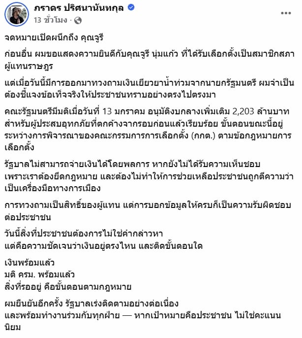 วันนี้สิ่งที่ประชาชนต้องการไม่ใช่คำกล่าวหา แต่คือความชัดเจนว่าเงินอยู่ตรงไหน และติดขั้นตอนใด เงินพร้อมแล้ว มติ ครม. พร้อมแล้ว สิ่งที่รออยู่ คือขั้นตอนตามกฎหมาย