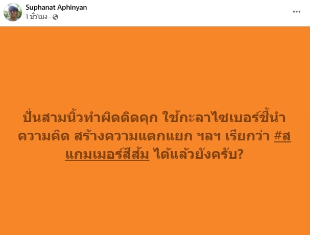 15 ก.พ. 2569 ดร.ศุภณัฐ อภิญญาณ หรือ “ดร.นิว” นักวิจัยภายใต้สถาบันวิจัย MAST Center และ คณะวิศวกรรมชีวการแพทย์ University of Arkansas ประเทศสหรัฐอเมริกา โพสต์เฟซบุ๊ก Suphanat Aphinyan “ปั่นสามนิ้วทำผิดติดคุก ใช้กะลาไซเบอร์ชี้นำความคิด สร้างความแตกแยก ฯลฯ เรียกว่า #สแกมเมอร์สีส้ม ได้แล้วยังครับ?”